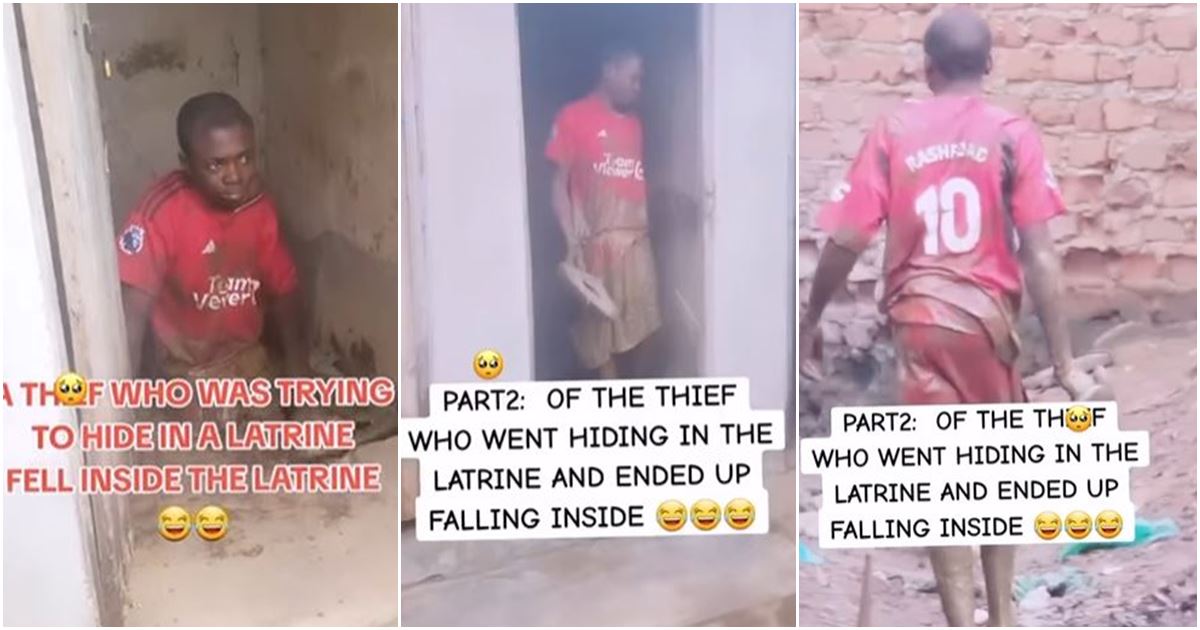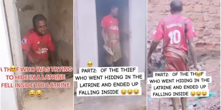- A video capturing an alleged thief’s misfortune, falling into a pit toilet while attempting to evade capture, has sparked widespread reactions online.