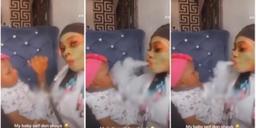 In the clip which appeared to have been first shared by the young lady (the baby’s mom), she is seen carrying the child in her hand while inhaling the toxic substance.
