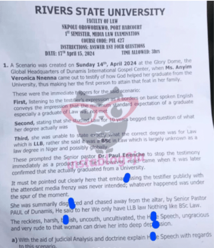 River State University has sparked a whirlwind of reactions among netizens with its recent law examination, which featured a scenario depicting the dramatic clash between Pastor Paul Enenche and his church member Veronica Anyim.