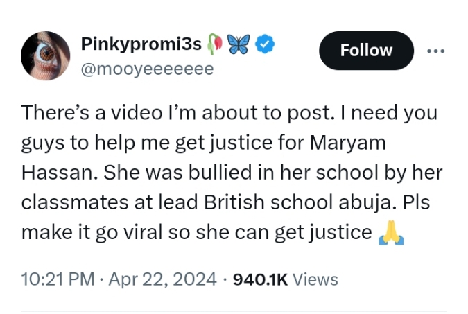 “There’s a video I’m about to post. I need you guys to help me get justice for (sic). She was bullied in her school by her classmates at Lead British School, Abuja. Pls make it go viral so she can get justice,” the post read.