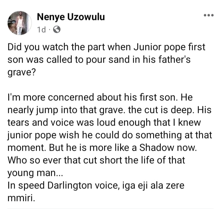 “Did you watch the part when Junior pope first son was called to pour sand in his father’s grave? “I’m more concerned about his first son. He nearly jump into that grave. the cut is deep. His tears and voice was loud enough that I knew junior pope wish he could do something at that moment. But he is more like a Shadow now. Who so ever that cut short the life of that young man… “In speed Darlington voice, iga eji ala zere mmiri.”