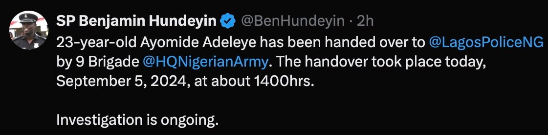 “23-year-old Ayomide Adeleye has been handed over to @LagosPoliceNG by 9 Brigade @HQNigerianArmy. The handover took place today, September 5, 2024, at about 1400hrs. Investigation is ongoing,” Hundeyin wrote.