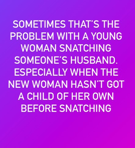 “SOMETIMES THAT’S THE PROBLEM WITH A YOUNG WOMAN SNATCHING SOMEONE’S HUSBAND. ESPECIALLY WHEN THE NEW WOMAN HASN’T GOT A CHILD OF HER OWN BEFORE SNATCHING.”