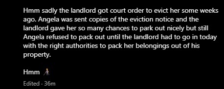 Hmm sadly the landlord got court order to evict her some weeks ago. Angela was sent copies of the eviction notice and the landlord gave her so many chances to park out nicely but still Angela refused to park out until the landlord had to go in today with the right authorities to park her belongings out of his property.