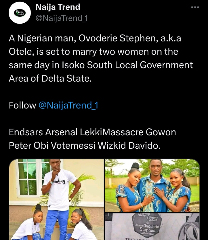“A Nigerian man, Ovoderie Stephen, also known as Otele, is set to wed two women on the same day in Isoko South Local Government Area of Delta State.”