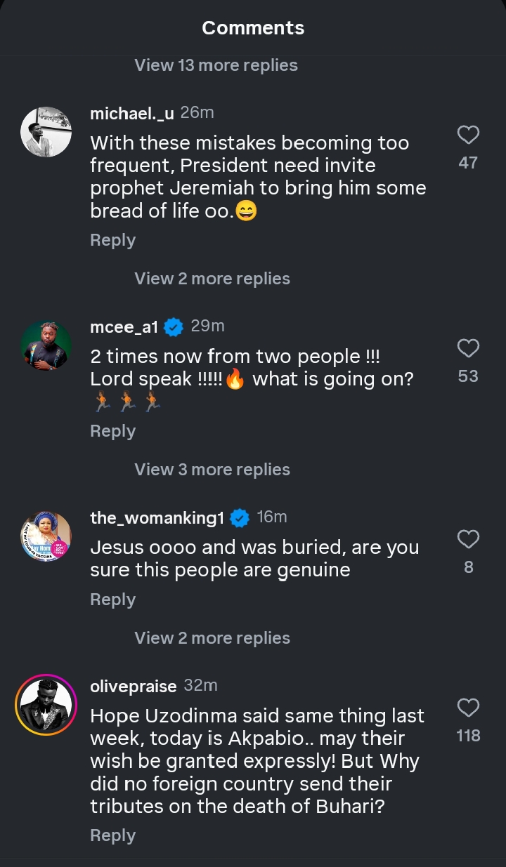 This is coming after Imo State Governor Hope Uzodinma also made a similar verbal error while paying tribute to the late President. During a church service in honour of Buhari, Uzodinma almost prayed for the “soul of former President Tinubu” before stopping mid-sentence and correcting himself. That incident, too, was caught on video and circulated widely on social media, drawing both mockery and concern.