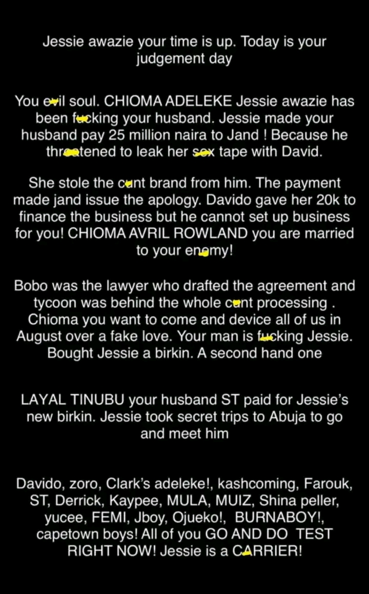 “Jessie Awazie has been sleeping with your husband. Davido gave her $20,000 to start a business. But he cannot even open a business for you,” the poster wrote, directing the message at Chioma.