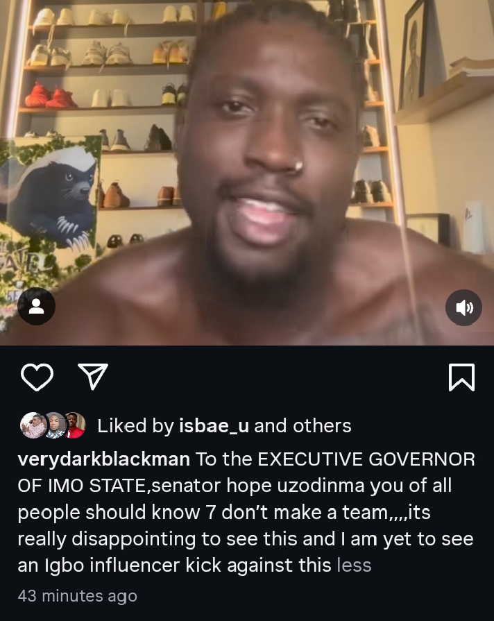 Controversial social media critic, VeryDarkMan, has sparked a new political storm following his reaction to Imo State Governor Hope Uzodinma’s selective celebration of Super Falcons players, accusing him of promoting ethnic bias.