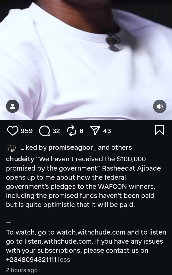 In a recent interview with media personality Chude Jideonwo, Super Falcons captain Asisat Ajibade addressed the Federal Government’s promised rewards following Nigeria’s victory at the 2024 Women’s Africa Cup of Nations (WAFCON).