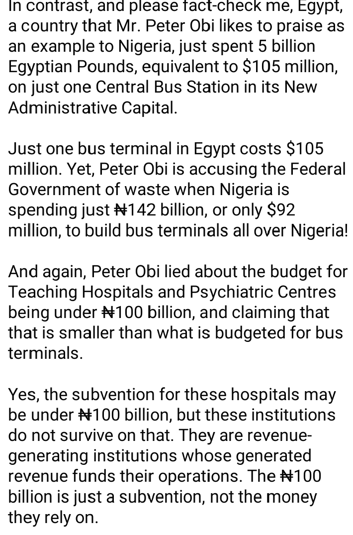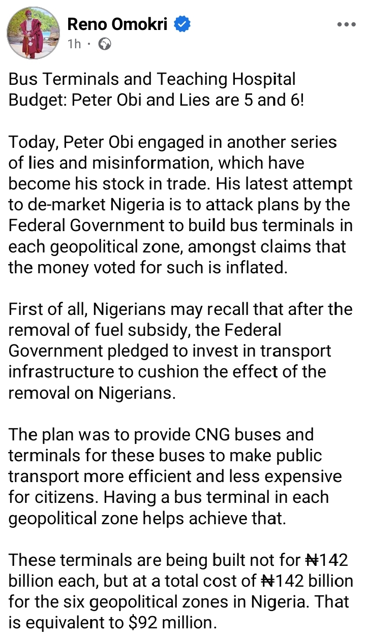 “Bus Terminals and Teaching Hospital Budget: Peter Obi and Lies are 5 and 6,” Omokri wrote. He explained that the ₦142 billion was not for each terminal but for all six, amounting to about $92 million in total. Drawing comparisons, Omokri cited Egypt, which recently spent the equivalent of $105 million on just one central bus station.