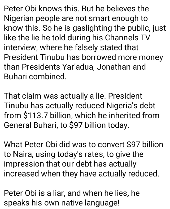Omokri further accused Obi of gaslighting the public, recalling his earlier claim that President Tinubu borrowed more than past Nigerian presidents combined. “That was a lie,” Omokri stated, adding that Tinubu had actually reduced Nigeria’s debt from $113.7 billion to $97 billion.
