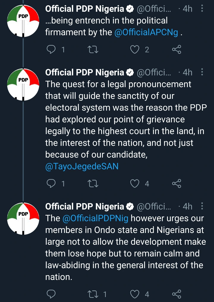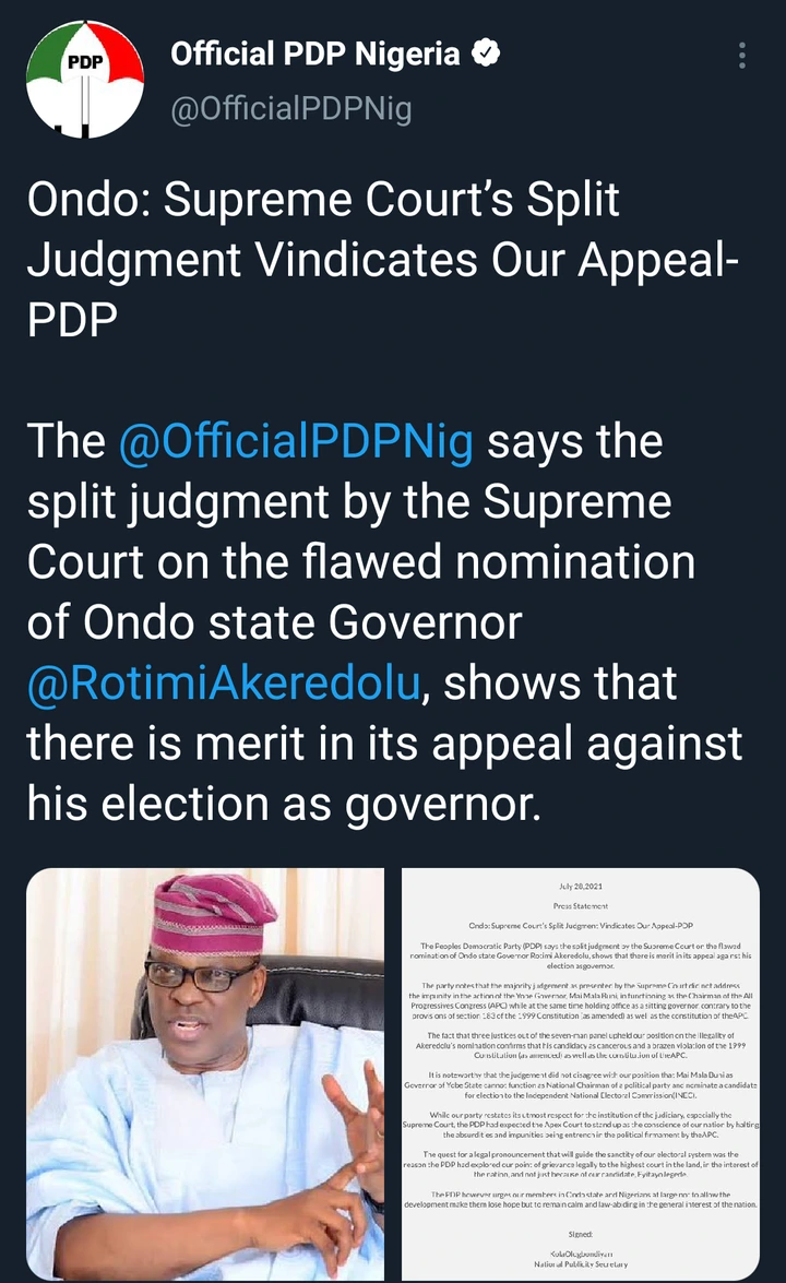 The People’s Democratic Party has reacted to the Supreme Court judgement that affirmed the victory of Rotimi Akeredolu in the Ondo State governorship election that was held in October 2020.