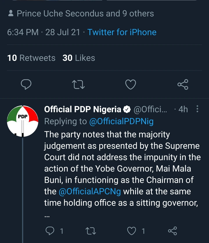 “The party notes that the majority judgement as presented by the Supreme Court did not address the impunity of the action of the Yobe Governor, Mai Mala Buni, in functioning as the Chairman of the APC while at the same time holding office as a sitting governor, contrary to the provisions of section 183 of the 1999 Constitution (as amended) as well as the constitution of the APC.”