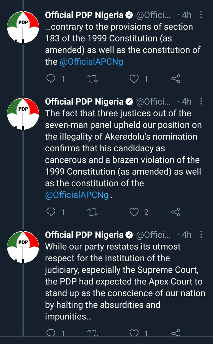 In reaction to the judgement delivered by the Supreme Court on Wednesday, the PDP said the split judgement vindicates its appeal. The PDP said the fact that three judges of the court agreed with the appeal shows that it was genuine.