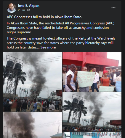 On the Facebook page of an APC chieftain in the state, Barr Imo Akpan, the congress held in the state has turned into a mini-war theater as aggrieved members resorted to violence by burning the party flags and defacing some parts of the state party headquarters in the Ikot Ekpene road party headquarters in the capital city of Uyo, Akwa Ibom state.