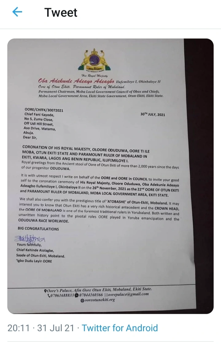 He disclosed that he was delighted and humbled to have been conferred with the title of Atobashe of Otun-Ekiti, Mobaland by HRM Oba Adekunle Adeayo Adeagbo, the Oore of Otun Ekiti.