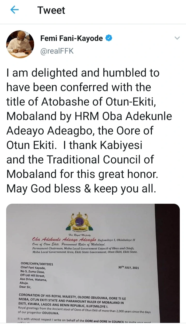 Former Aviation Minister and PDP chieftain, Fani-Kayode recently received a new chieftaincy title. The outspoken minister shared the news on his social media page.