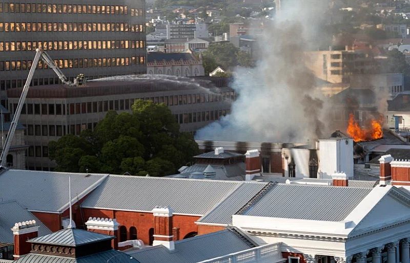 The fire was believed to have started in one of the older buildings in the parliament precinct, leading to a security cordon nearby the cathedral where anti-apartheid icon Archbishop Desmond Tutu was buried just hours before.