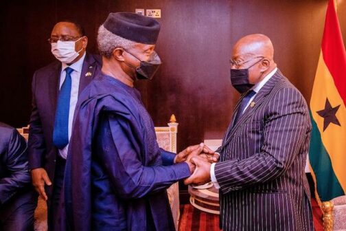 Osinbajo was received at the Kotoka International Airport, Accra, by Nigeria High Commissioner in Ghana, retired Vice Admiral Ibok-Ete Ibas and Kwaku Ampratwum-Sarpong, Ghanaian Deputy Minister for Foreign Affairs and Regional Integration.