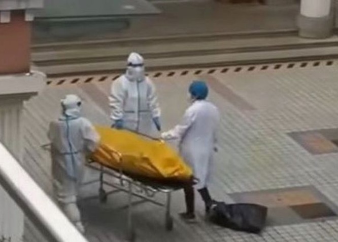 Footage from China shows hazmat suited nurses carrying the body bag with the pensioner to a hearse to cremate him.