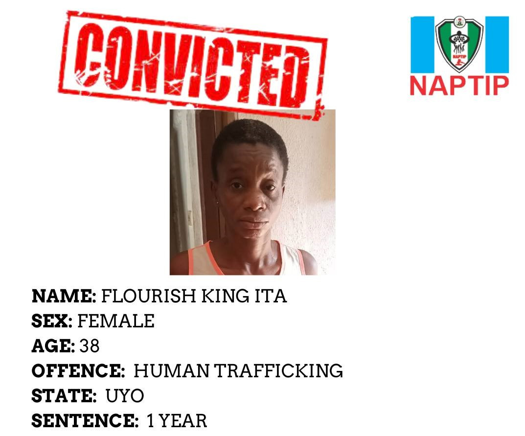 38-year-old woman, Flourish King Ita, has been sentenced to one year imprisonment for human trafficking in Akwa Ibom State.