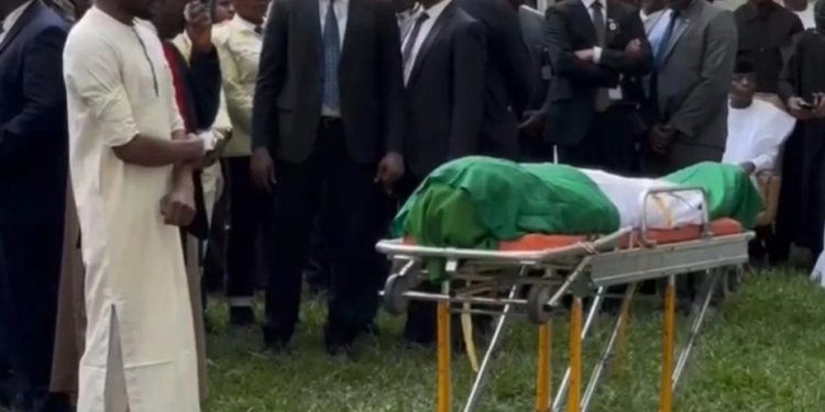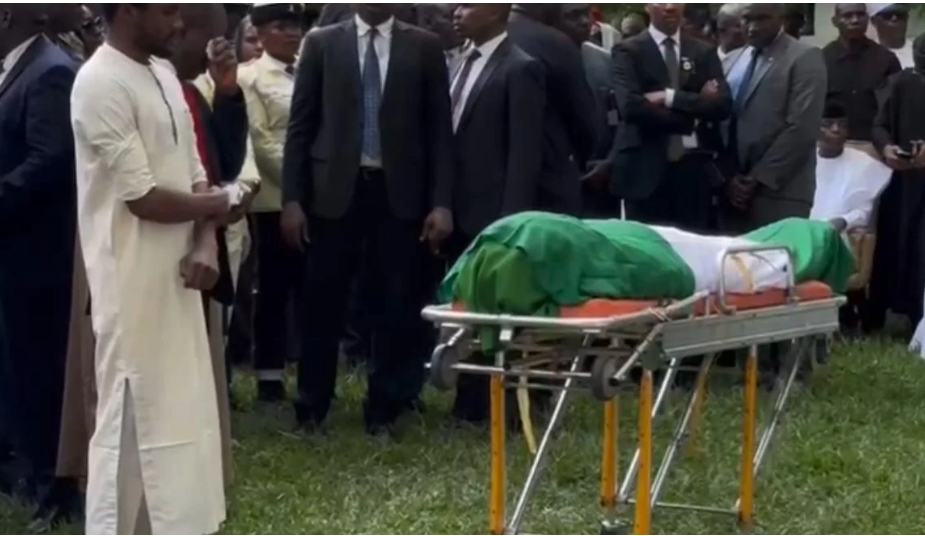 The burial was conducted with military honours as pallbearers wheeled his body, draped in the Nigerian flag, to the graveside.