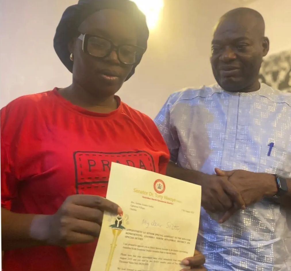 In a photo circulating online, Senator Nwoye was seen handing her an appointment letter. The senator also confirmed the appointment to newsmen on Sunday.