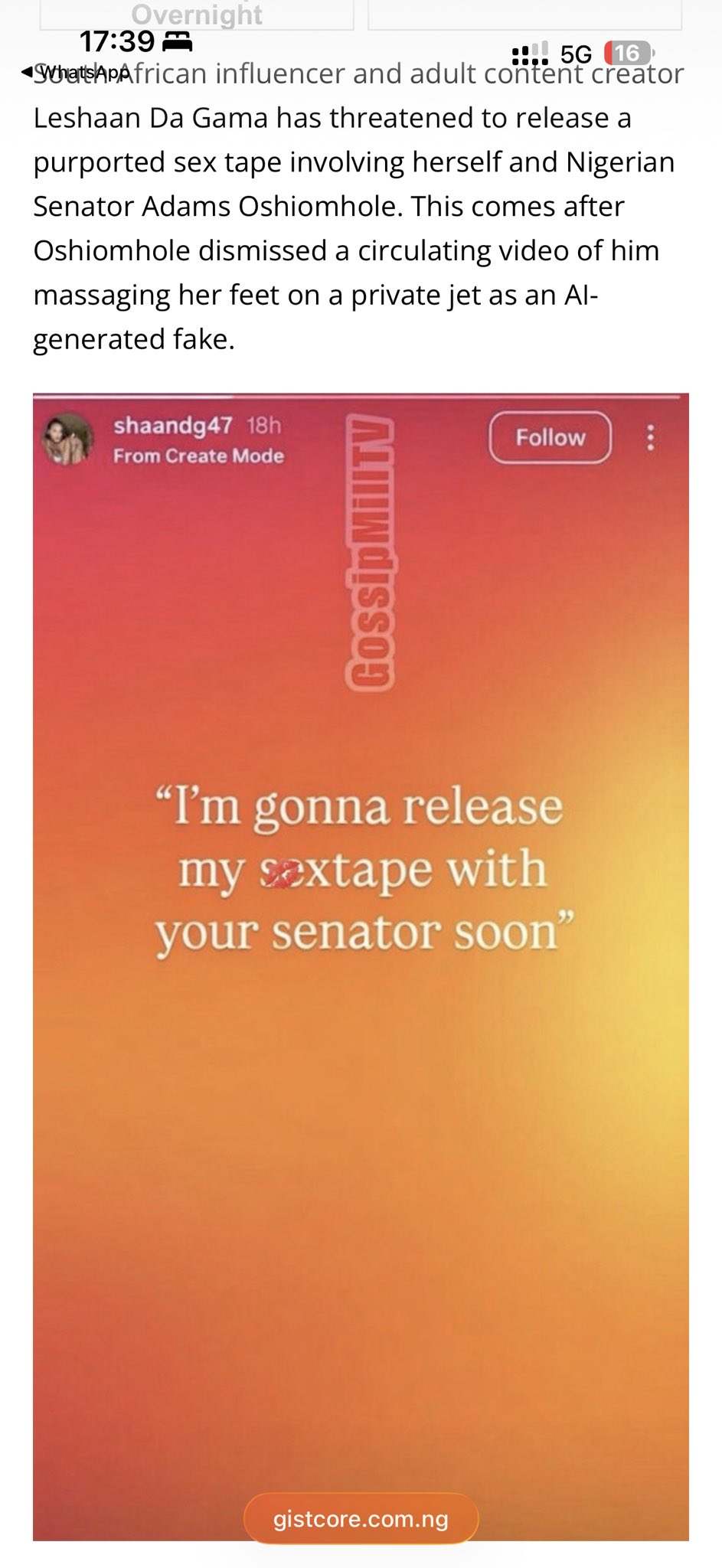 In a series of posts on her Instagram account on Friday, she refuted claims that the video was created using artificial intelligence. “Video not AI but believe you senator”, she wrote on her Instagram story on Friday. In another post, she threatened to release a sex tape she had with the senator. “I’m gonna release my sex tape with your senator soon,” she wrote.
