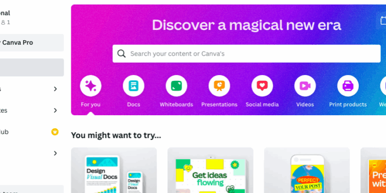 Once logged in, you’ll land on the Canva home page. It’s like your design dashboard. Here, you’ll find a search bar at the top to quickly find templates or design elements. On the left side, there’s a menu with options like ‘Home’, ‘Templates’, ‘Projects’, and ‘Learn’. The home page is where all your recent projects are displayed, making it easy to pick up where you left off.