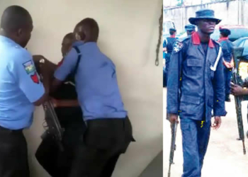 This trending video shows some police officers strugging to disarm an officer of the Nigeria Security Civil Defense Corps NSCDC ...