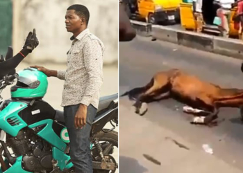 VIDEO: Horse used in place of Okada in some areas in Lagos collapses after few hours of work