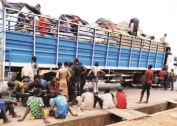 A truck loaded with fruits with about 50 persons comprising women, men and young children hidden underneath the fruits has ...