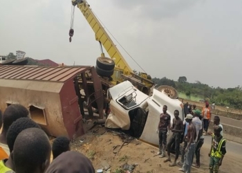 A truck carrying grain has derailed off the Lagos-Ibadan road forcing it to crush a pedestrian to death as it ...