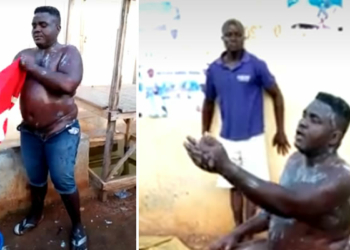 "This is not ordinary" Nigerians attack man seen bathing naked in broad daylight at a T-junction in Lagos