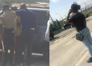 Married Nigerian man pulls out belt and flogs his wife after she slapped his 'young side chick' at Filmhouse Cinemas.