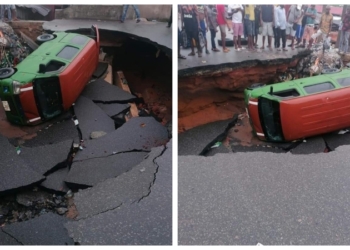Panic as a sinkhole caused by heavy rainfall appeared in the middle of the road in Ogbor Hill, just after ...