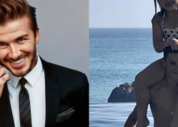 Pictured is David Beckham with his four children, Brooklyn, Romeo, Cruz and Harper. They are all on vacation with Victoria ...