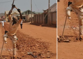 #NigerianYouthsAreNotLazy: Photos of One-legged man carrying out road construction goes Viral